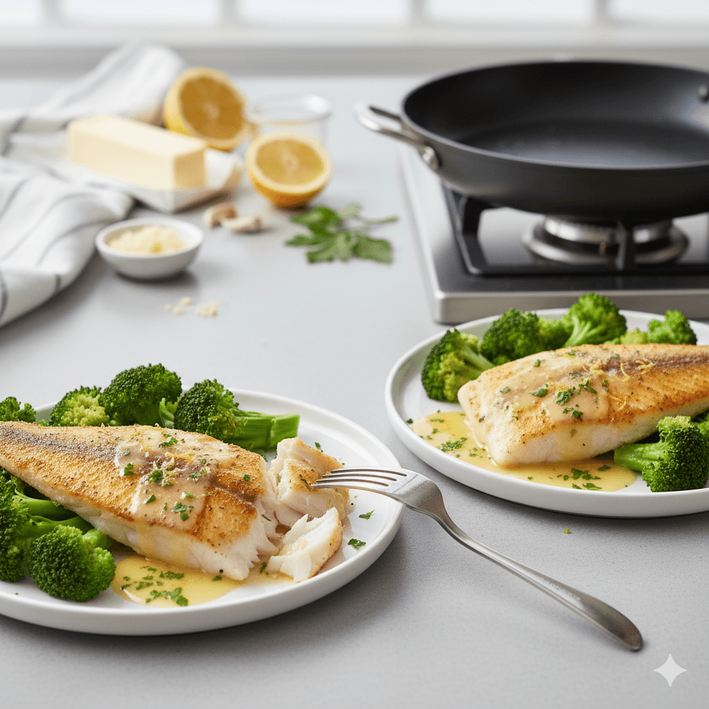 Pan-Fried Haddock with Garlic-Lemon-Butter Sauce and Broccoli